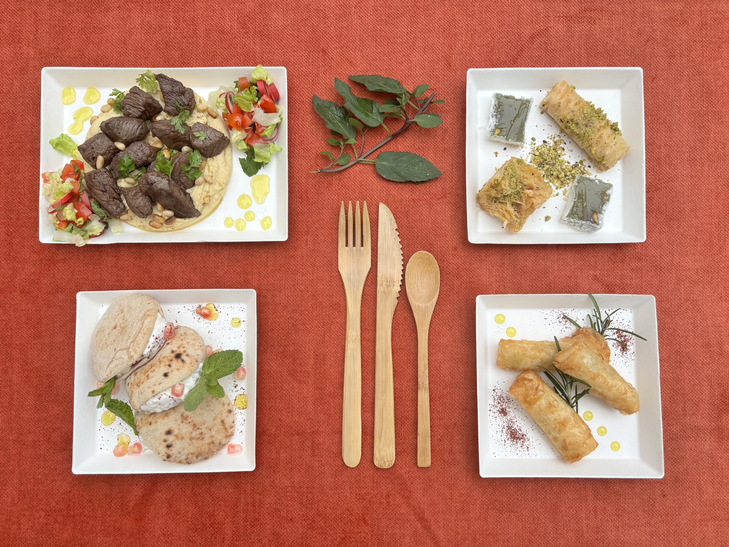 Houmous, bœuf poêlé aux Quatre épices & pignons de pin, Fattouch